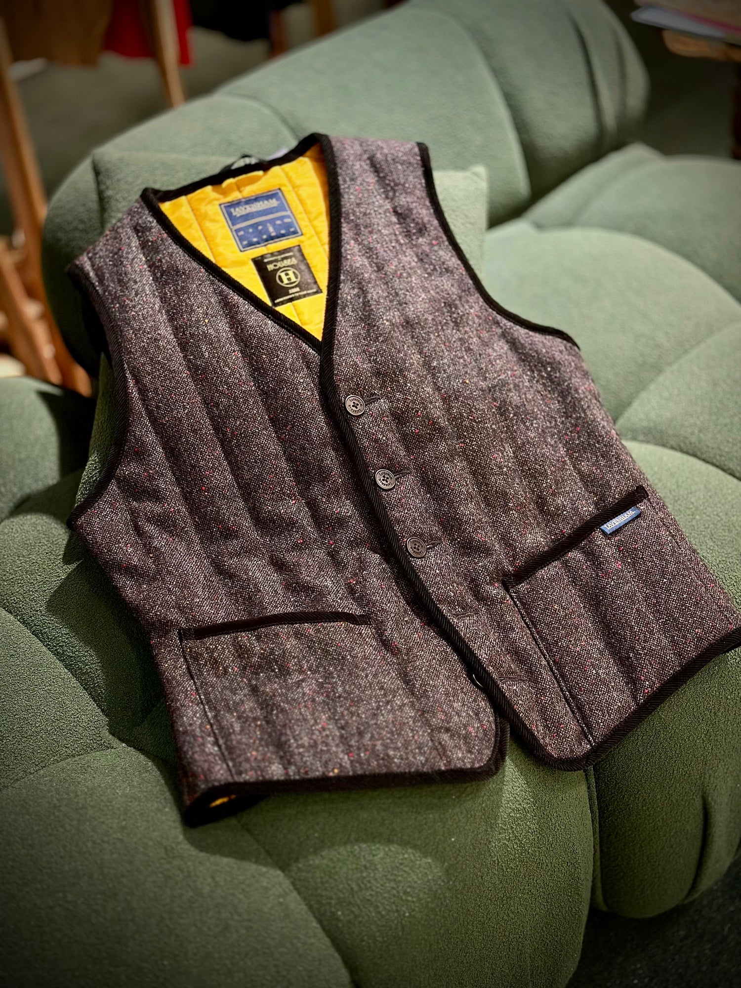 Our Houses x Lavenham Quilt Gilets a luxurious ''Abraham Moon" Scotland Wool Tweed fabric in Navy in signature 2” diamond quilt, the absence of a collar enables it to sit comfortable over a shirt for cooler summer evenings, but also over a heavier knit as the weather turns colder. It even works as a liner under your favourite winter coat.