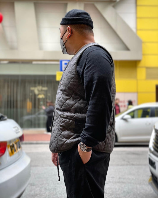 LAVENHAM x HOUSES HIGHTOWN Tweed Herringbone Quilted Hunting Gilets Charcoal