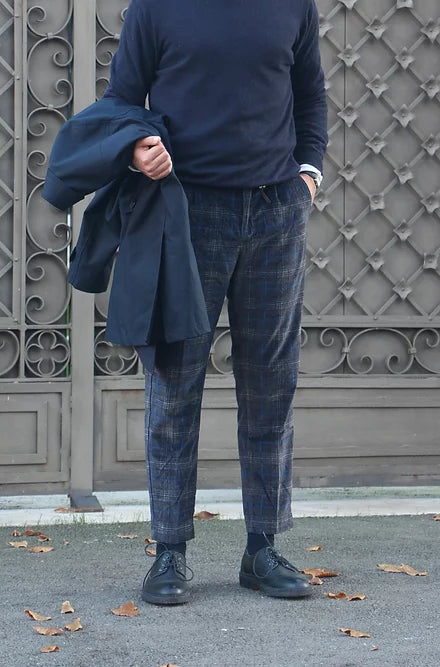 RBN Men's Pleats Relax Fit Velvet Trousers Check Blue/ Grey
