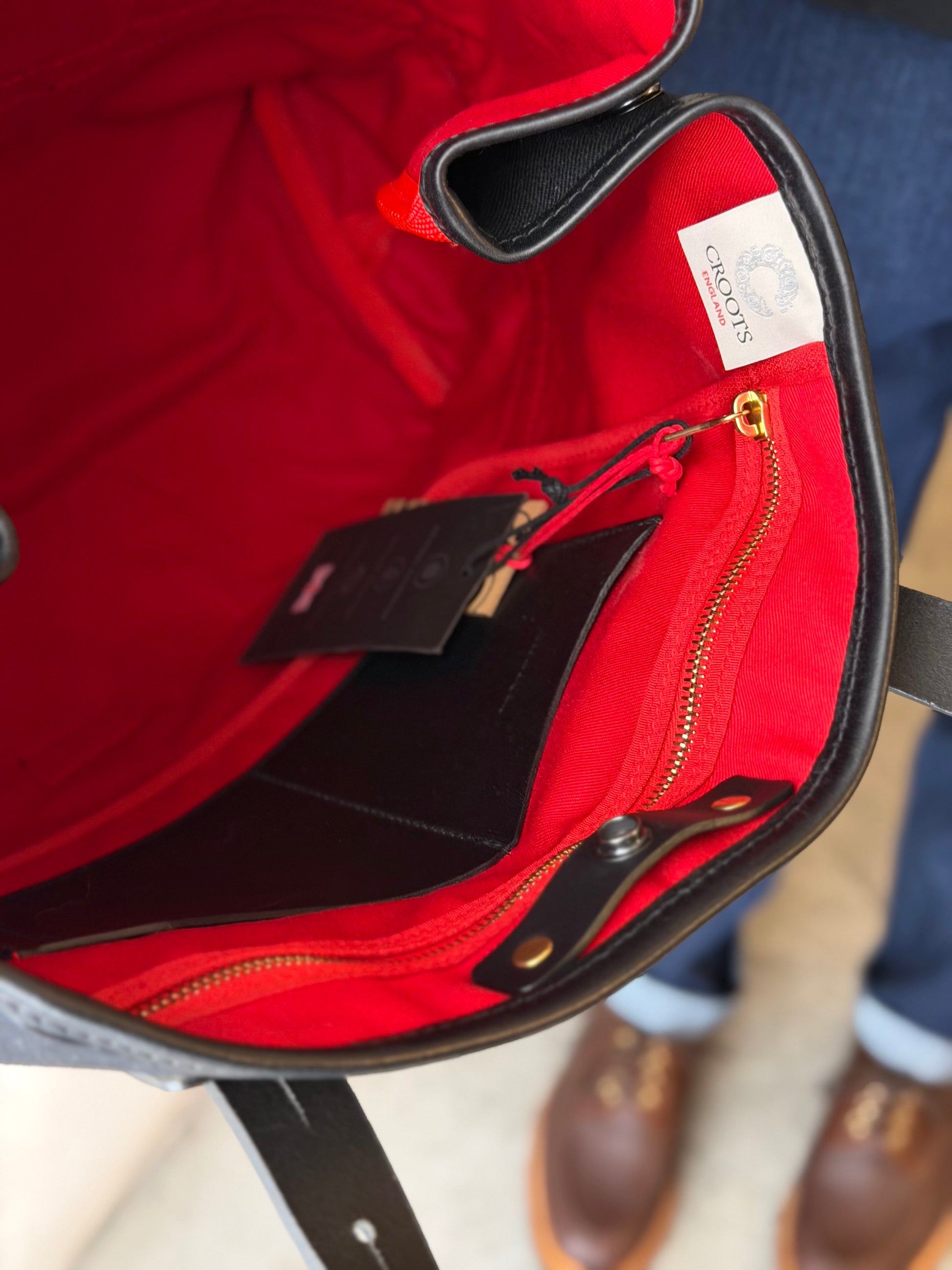 The range is trimmed with vegetable-tanned bridle leather, solid brass hardware and tonal Riri zips. It features all of our Croots hallmarks – hand-stitched details and our signature red premium cotton lining.