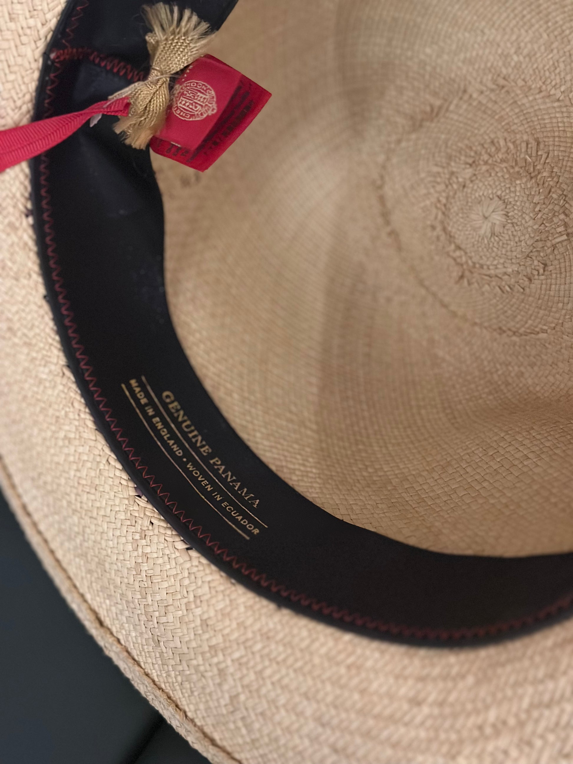 Christys’ Panama. A classic Grade 4 weave Panama. It is hand woven in Ecuador and made in England. Christys’ produces its Panama hat hoods in Ecuador using traditional weaving to craft a rough coned shape. They are then shaped, blocked by hand and finished with a band and a bow in its factory in Oxfordshire, England to the highest traditional standards.
