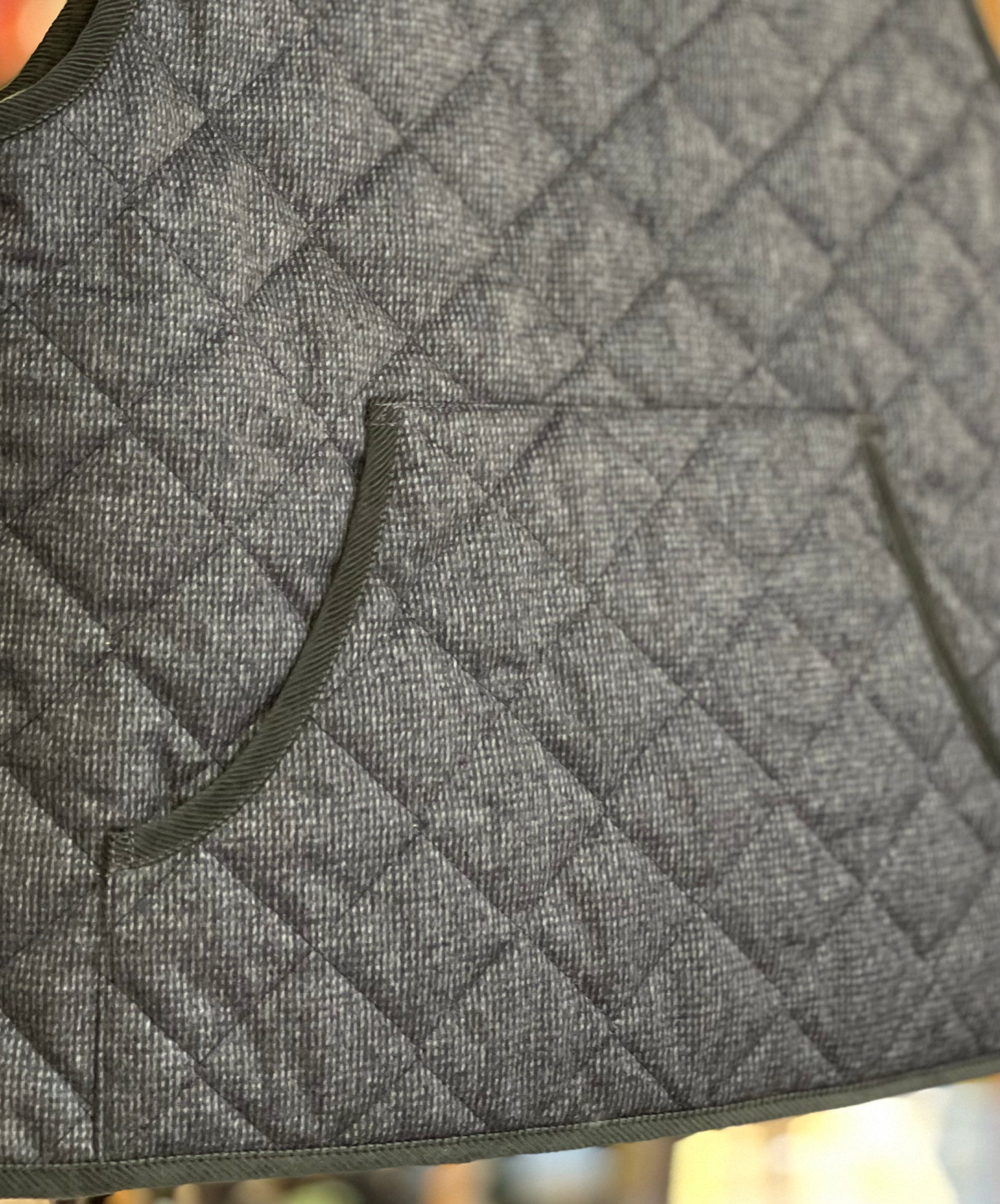 A luxurious Scotland Wool Tweed fabric in Charcoal Houndstooth Light Weight in signature 2” diamond quilt, the absence of a collar enables it to sit comfortable over a shirt for cooler summer evenings, but also over a heavier knit as the weather turns colder. It even works as a liner under your favourite winter coat.