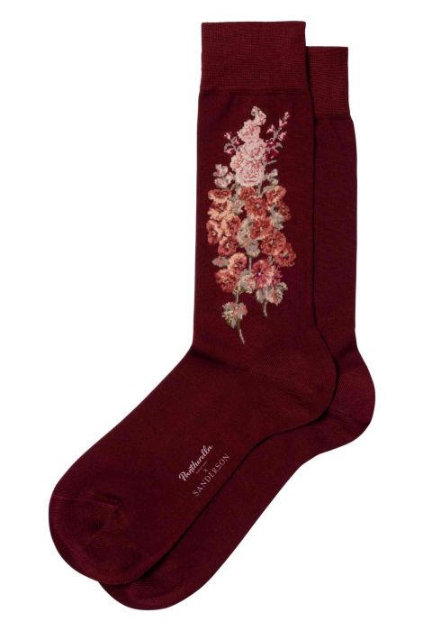 The Hollyhocks design, imagined by Sanderson and reinterpreted by Pantherella, adds bold elegance to men's cotton lisle dress socks. Expertly knitted onto classic black and modern mulberry socks, the unique bouquet adds undeniable flair for evening dress socks to complete any formal style.